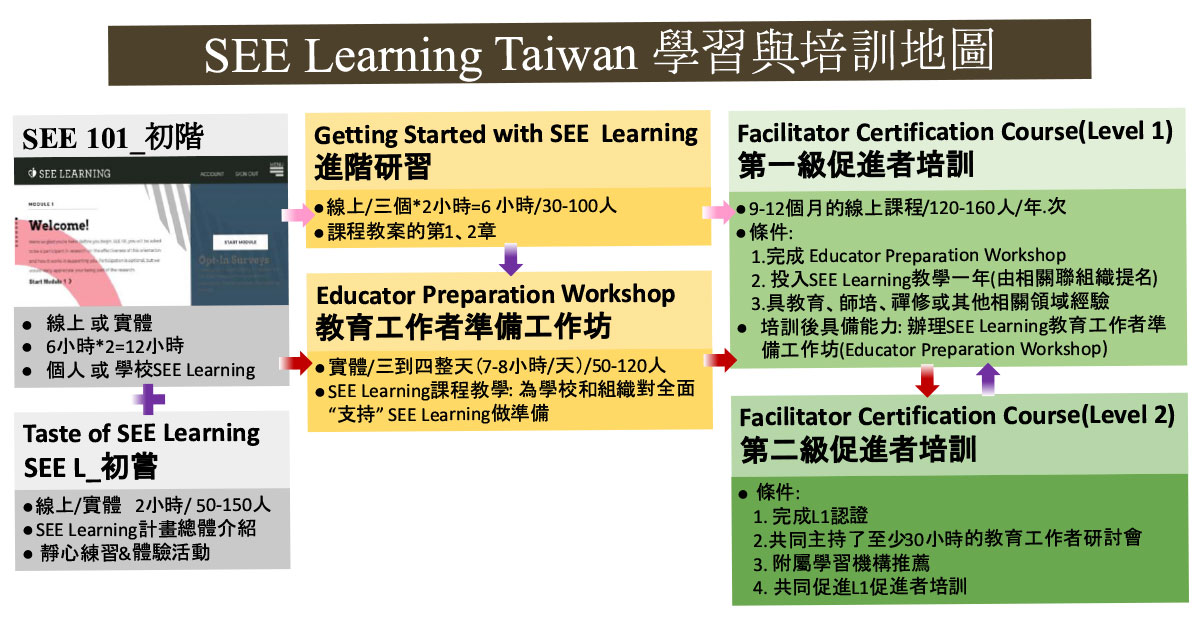 艾默里大學慈悲中心SEE Learning教學計劃中,為教育者設計了一套養成培訓課程「促進者培訓與認證課程(Facilitator Certification Course)」,完成進階研習或教育工作者準備工作坊的各地教育工作者,皆能報名參加Level 1培訓課程。如下: