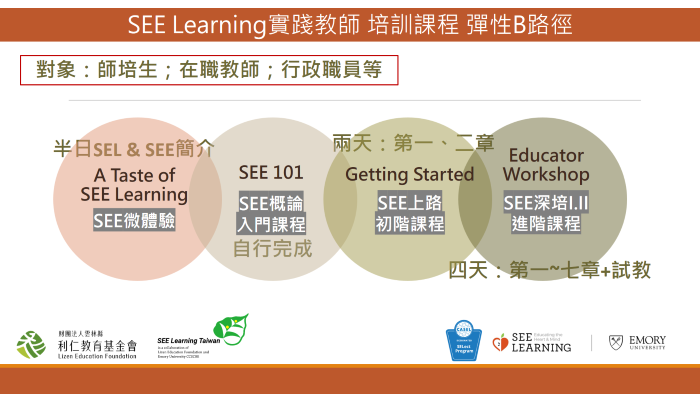 利仁教育基金會依據Emory大學SEE Learning課程規劃而設計了完整的培訓地圖,幫助老師們逐步深入學習SEE Learning,乃至加入社群夥伴,成為推廣SEE Learning的推手之一。培訓架構、資格與內容如下: